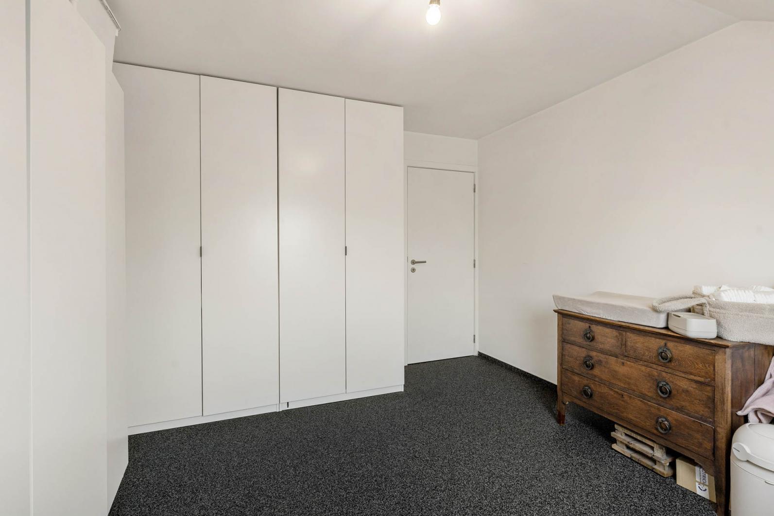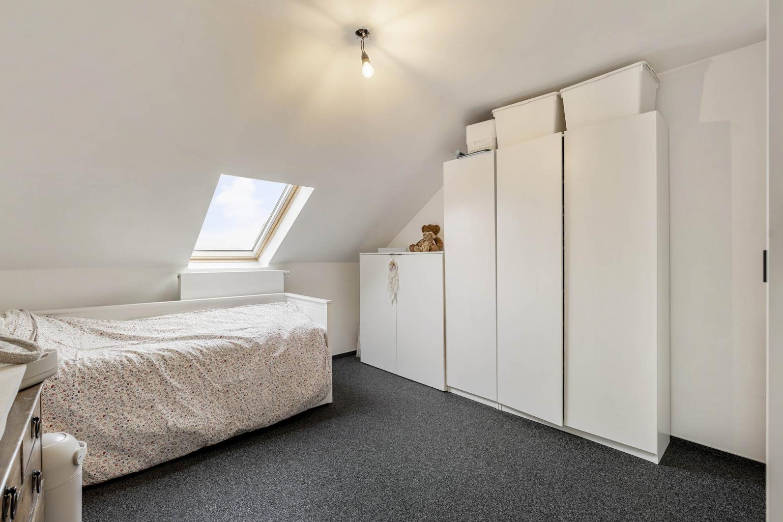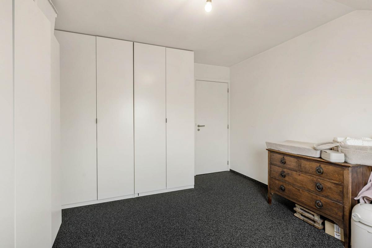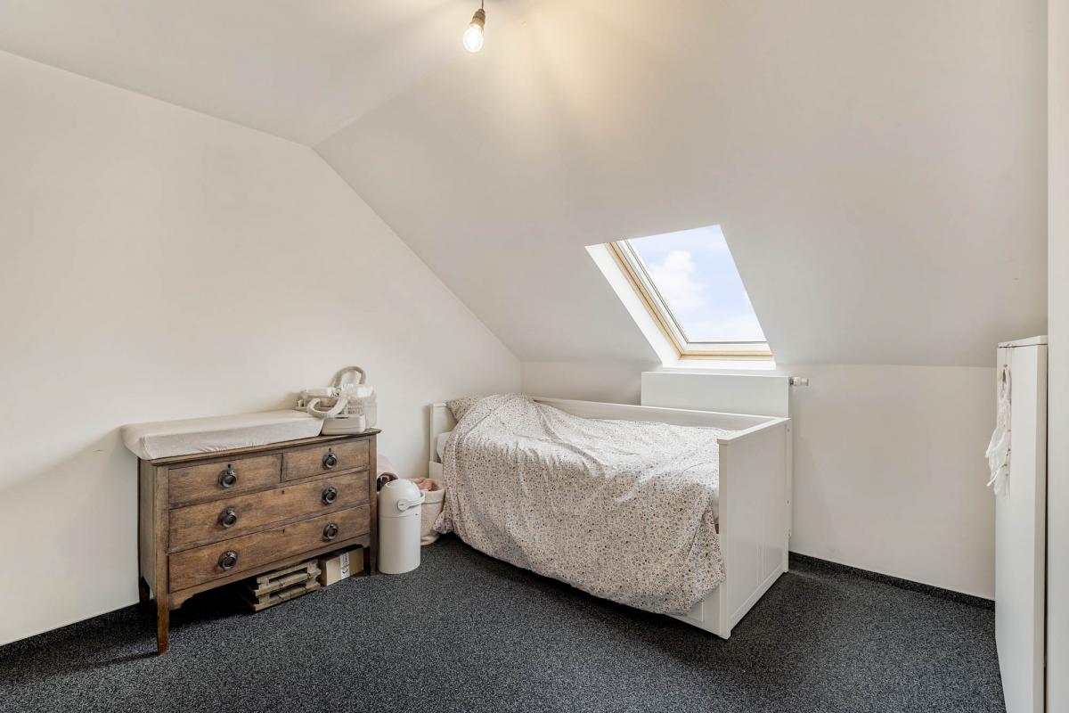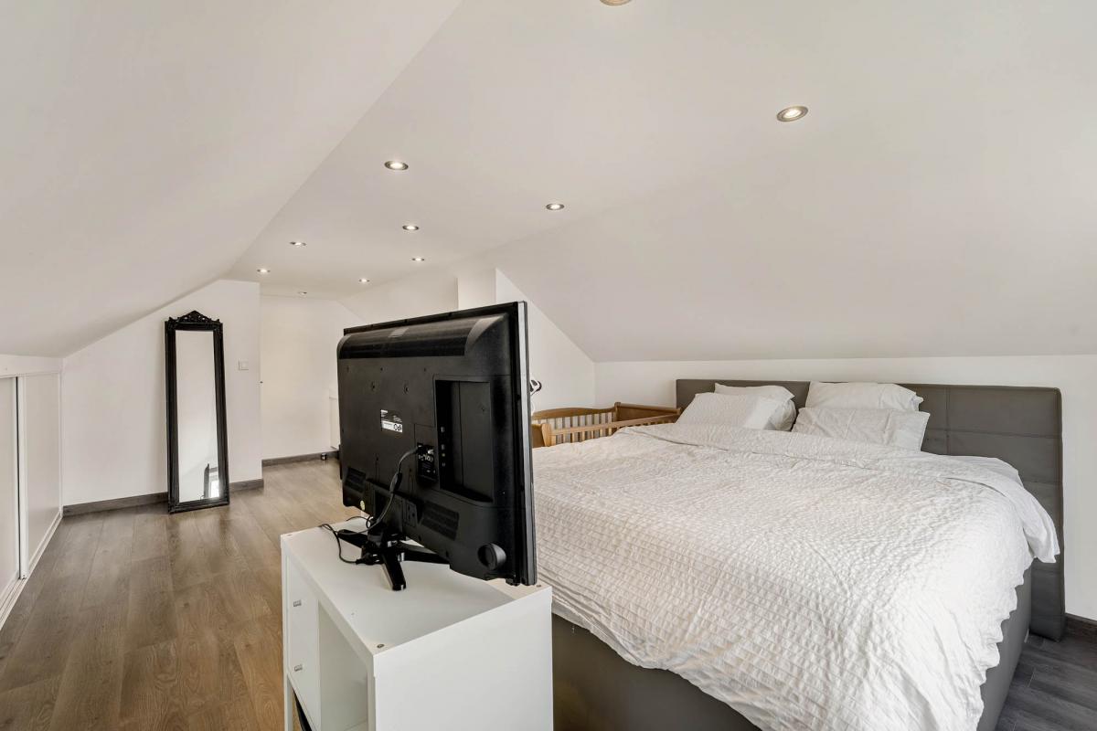Via de trap bereikt u de bovenverdieping, waar zich een zeer ruime tweede slaapkamer bevindt. De oppervlakte biedt hier tal van mogelijkheden, denk aan het creëren van een dressing of een rustige werkplek. Voor extra stockage beschikt het appartement bovendien over een grote kelderberging.