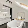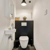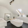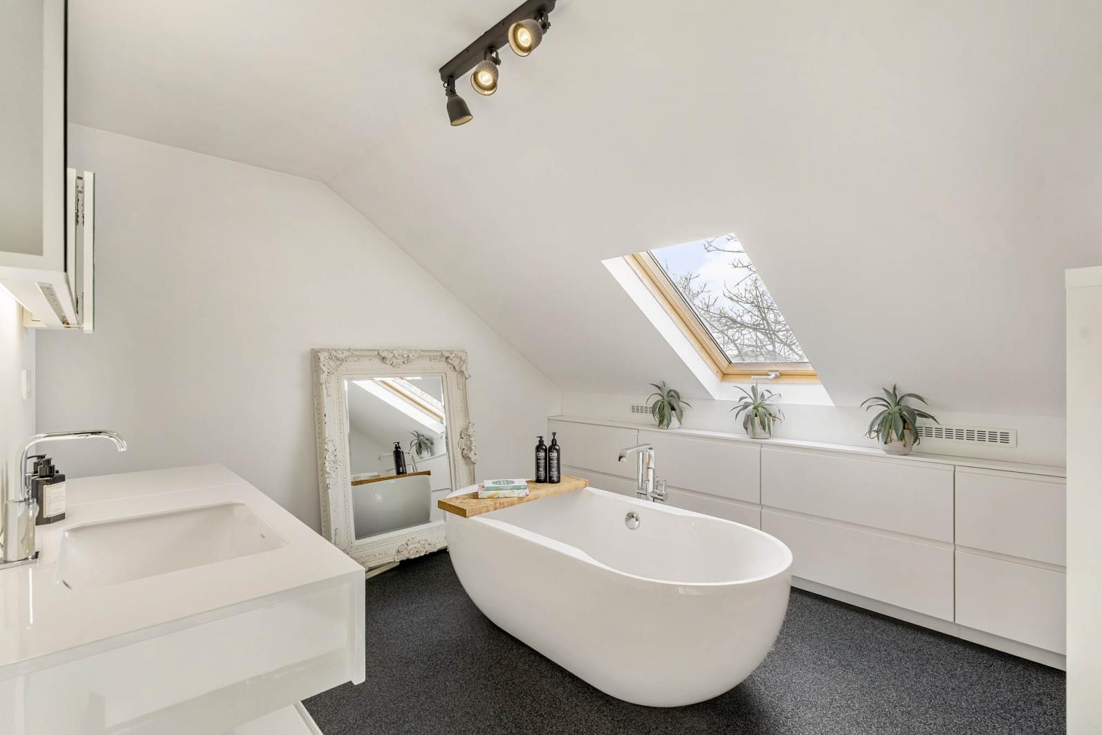 Verder bevinden zich op deze verdieping een praktische bergruimte, een apart gastentoilet, een slaapkamer en een ruime badkamer, uitgerust met zowel een ligbad als een inloopdouche en een wastafel.
