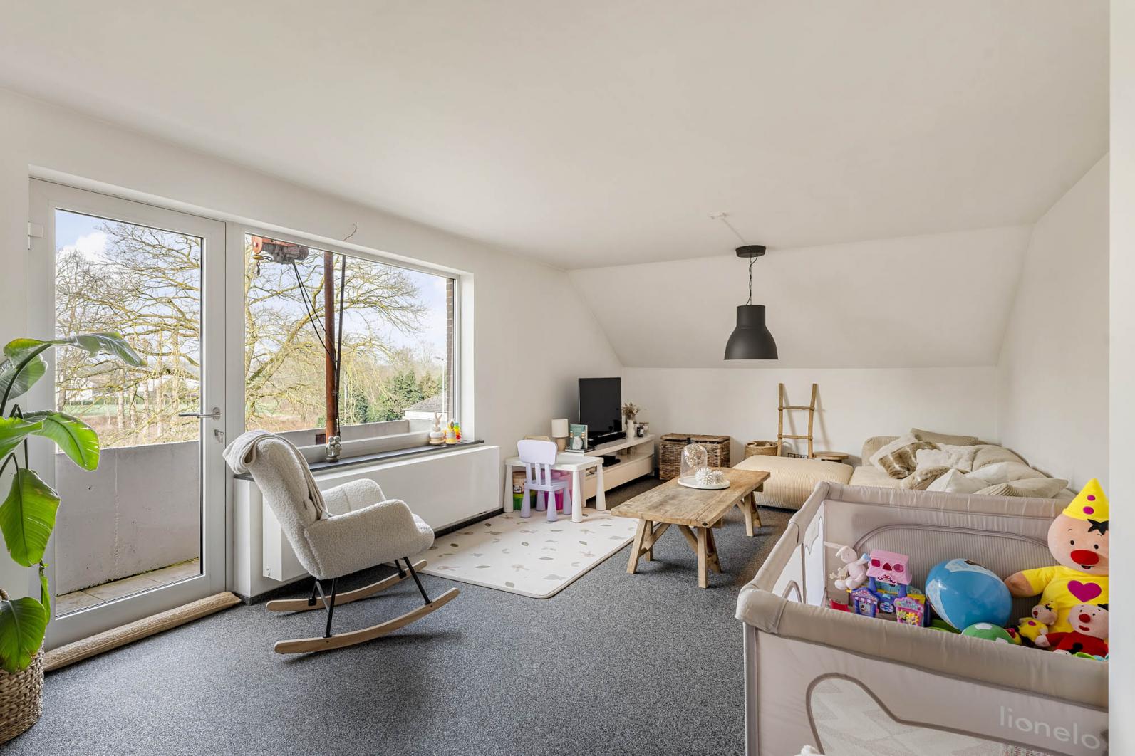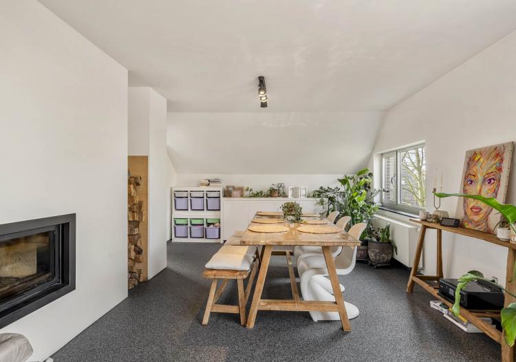 Op de eerste verdieping is er een ruime, lichtrijke leefruimte. Blikvanger is de authentieke houtkachel, die niet alleen zorgt voor een supergezellige sfeer tijdens de wintermaanden, maar ook slim is aangesloten op het verwarmingssysteem. Dankzij de combinatie van mazout, de houtkachel en een zonneboiler geniet dit appartement van een gunstig energielabel C, wat het bijzonder energiezuinig maakt in het dagelijks verbruik.