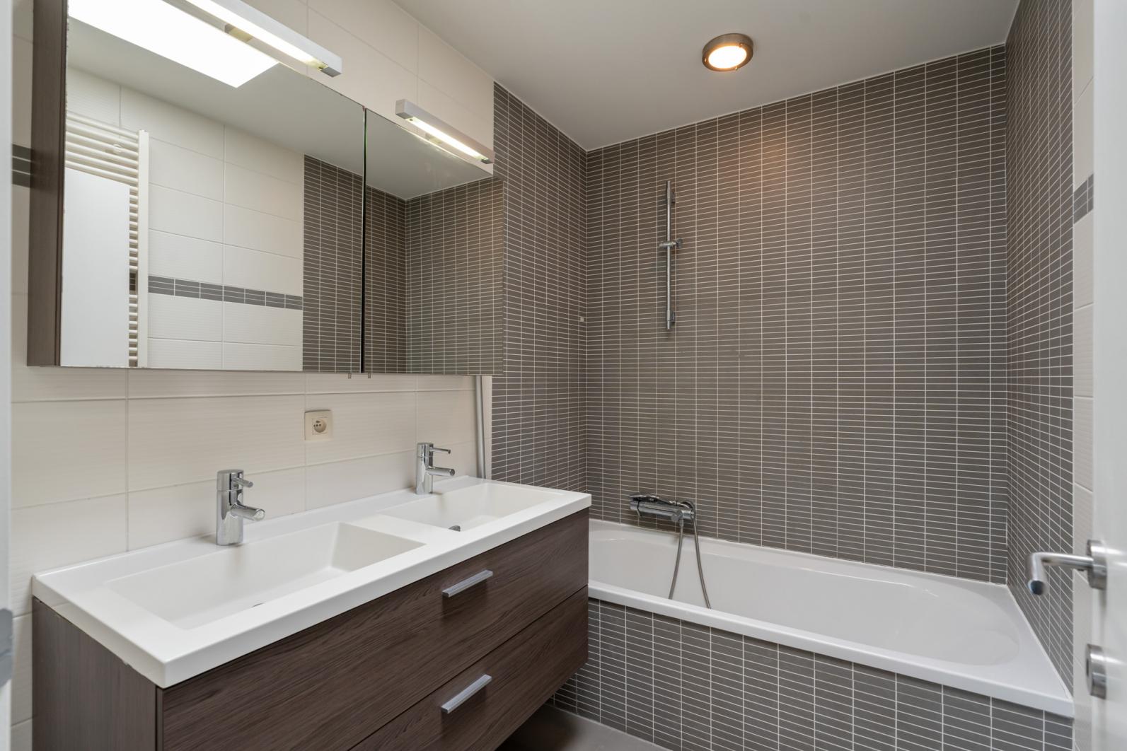 Aan de achterzijde bevinden zich twee slaapkamers, waarvan één directe toegang heeft tot het zijterras. De badkamer is uitgerust met ligbad/douche, dubbele wastafel en een verluchtingskoepel. Het aparte gastentoilet beschikt over een wastafel.