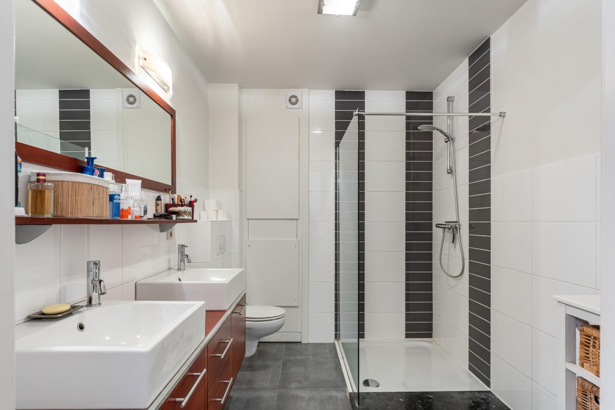 De verdieping is compleet met een grote badkamer die uitgerust is met een douche, een dubbele wastafel en een toilet, bovendien is er beneden ook nog een gastentoilet voorzien.
