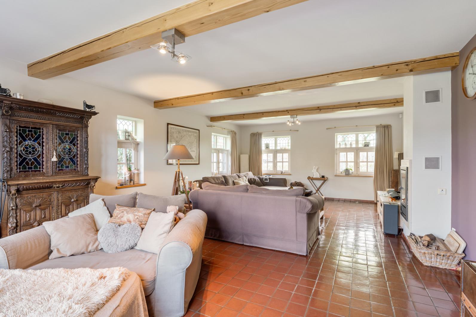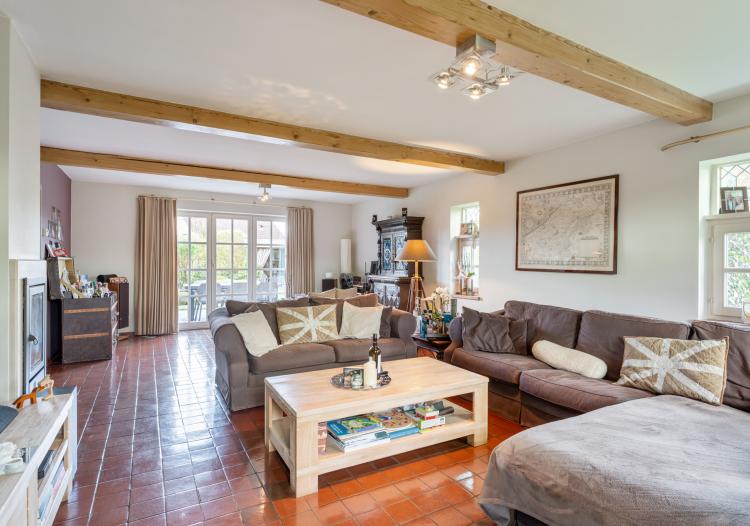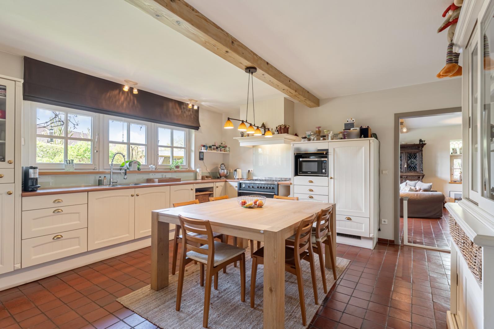 Bij het betreden van de woning valt direct de warme, landelijke sfeer op. De grote living is het hart van het huis, dankzij de grote raampartijen geniet u hier van een prachtig uitzicht op de tuin, terwijl de open haard zorgt voor extra gezelligheid tijdens de koudere maanden. De ruime, volledig ingerichte keuken is voorzien van een gasfornuis, oven en microgolfoven en biedt meer dan genoeg plek voor een grote eettafel. Direct aansluitend vindt u een praktische extra opbergruimte.