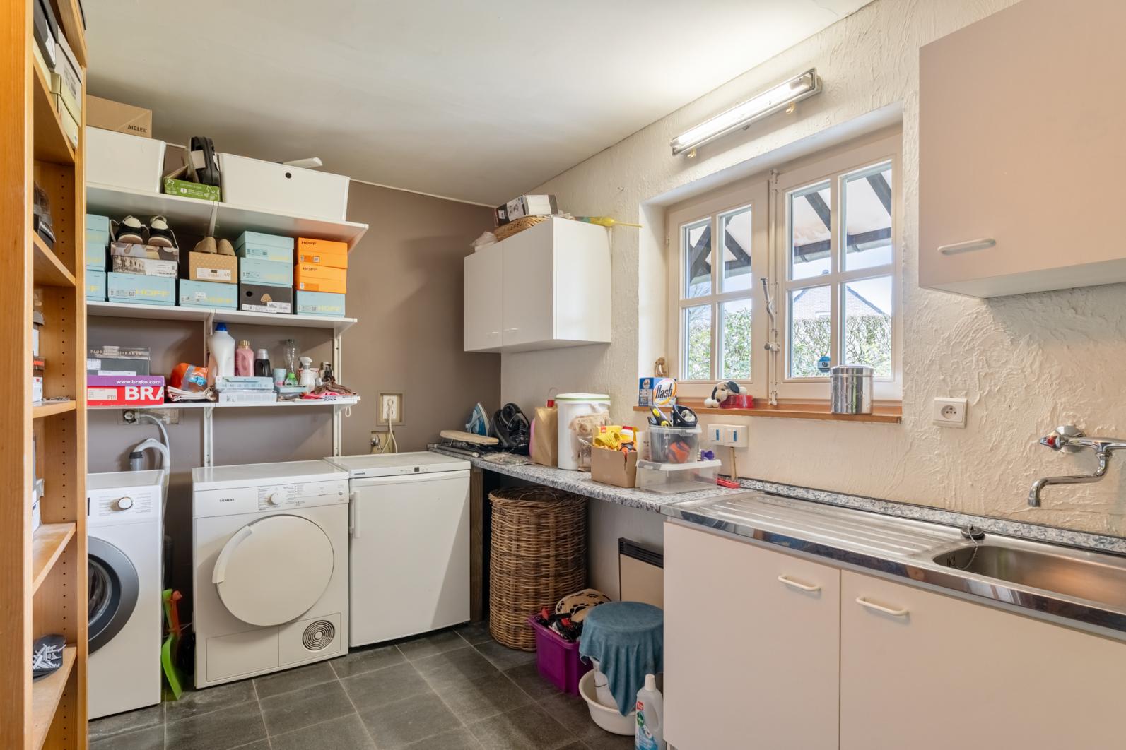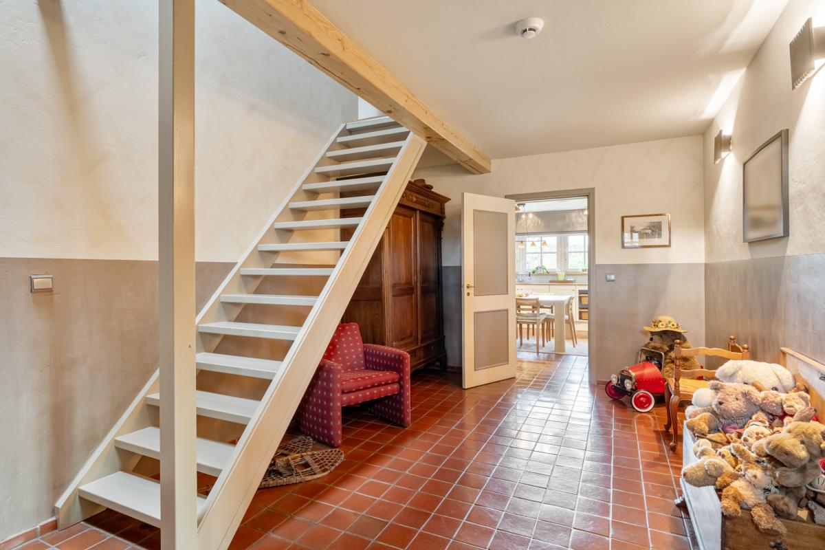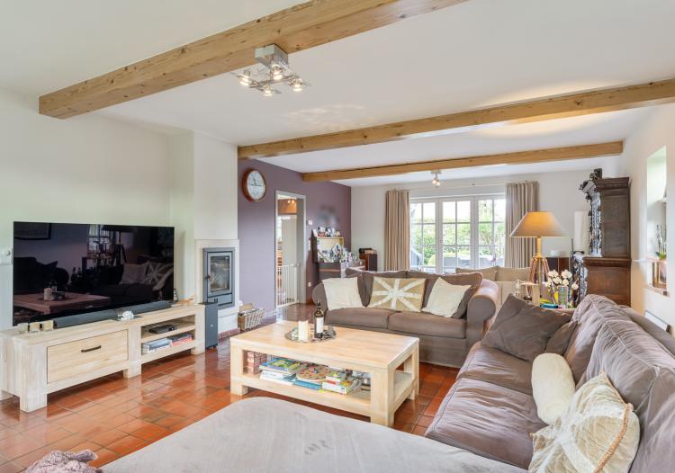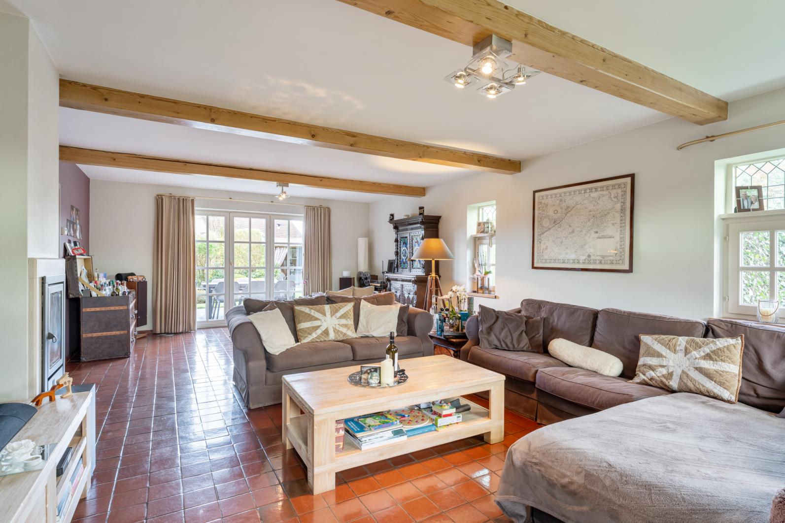 Bij het betreden van de woning valt direct de warme, landelijke sfeer op. De grote living is het hart van het huis, dankzij de grote raampartijen geniet u hier van een prachtig uitzicht op de tuin, terwijl de open haard zorgt voor extra gezelligheid tijdens de koudere maanden. De ruime, volledig ingerichte keuken is voorzien van een gasfornuis, oven en microgolfoven en biedt meer dan genoeg plek voor een grote eettafel. Direct aansluitend vindt u een praktische extra opbergruimte.