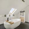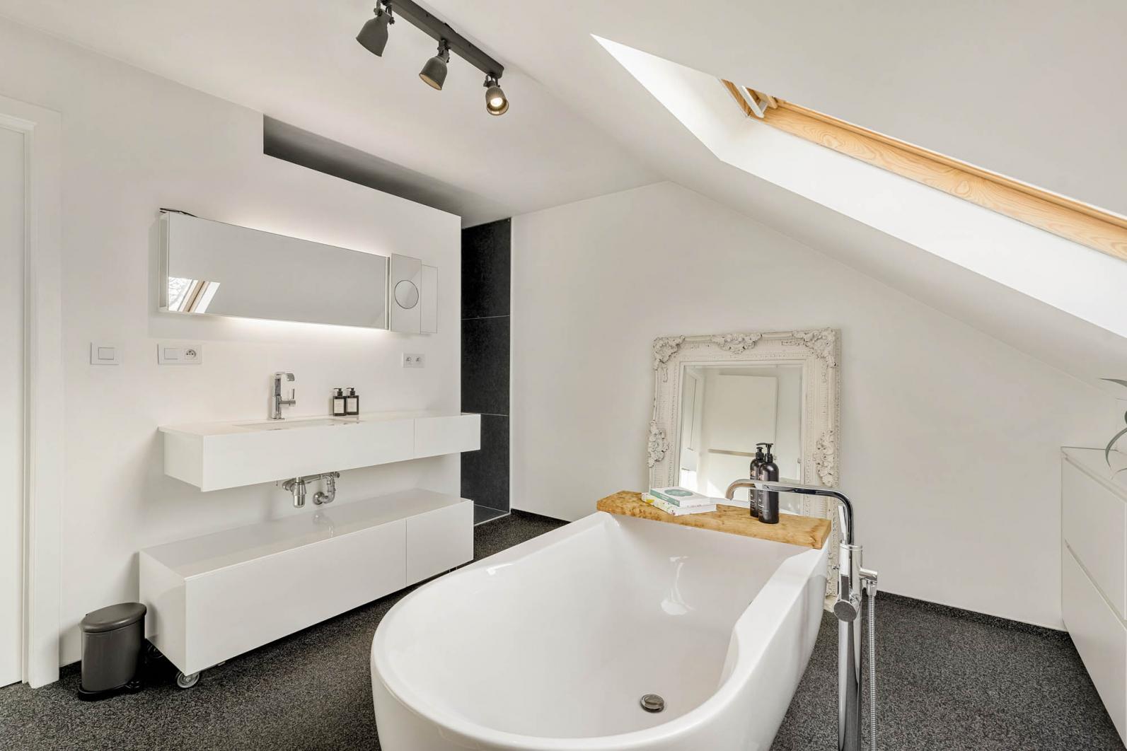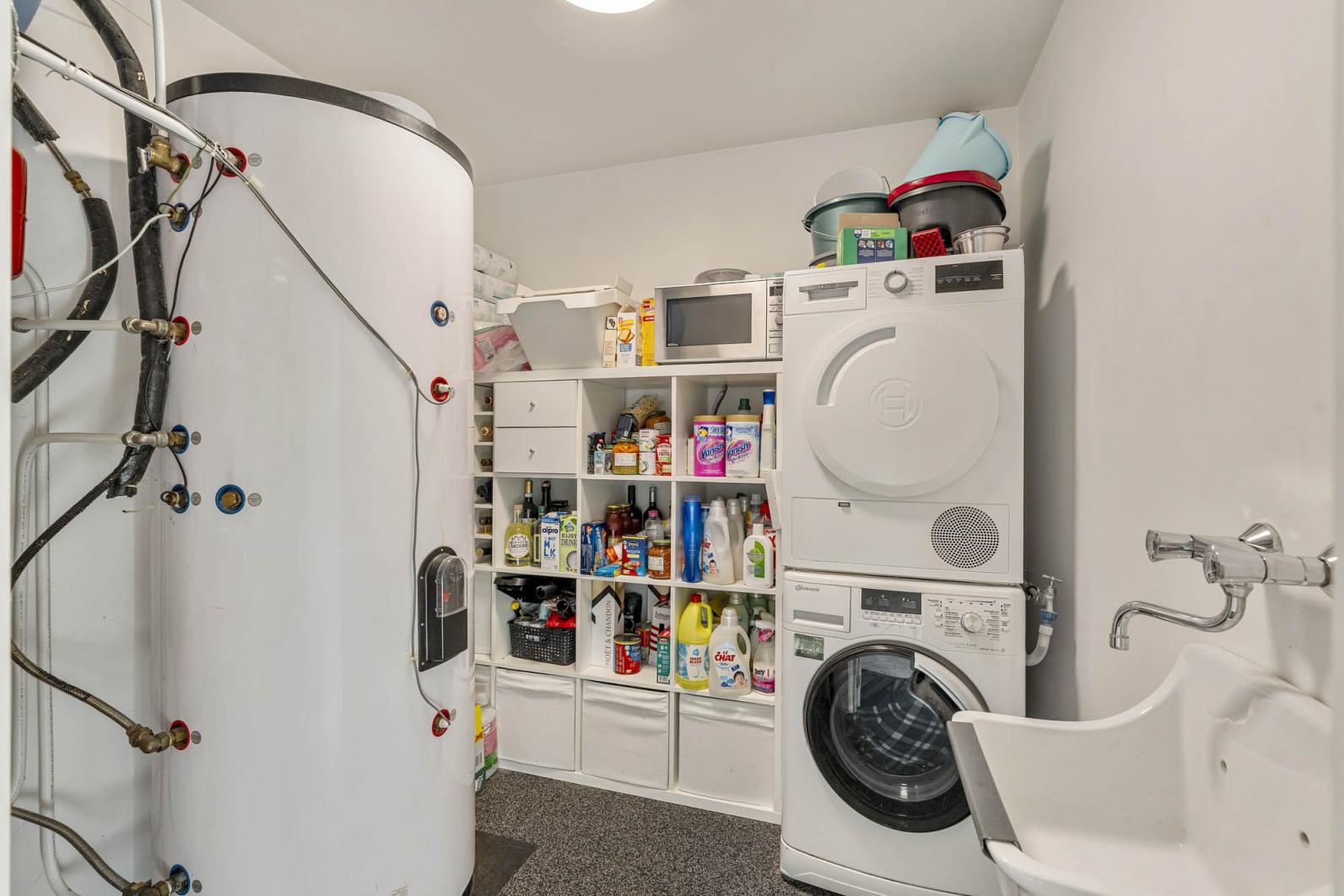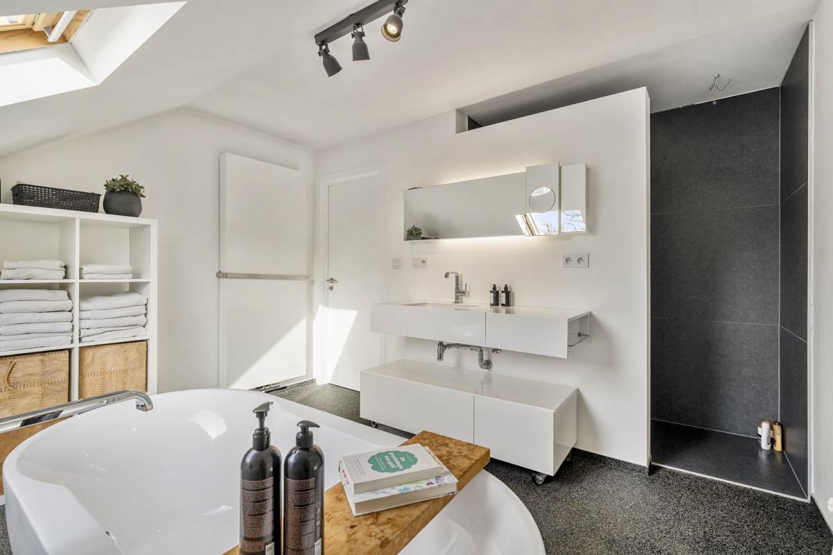 Verder bevinden zich op deze verdieping een praktische bergruimte, een apart gastentoilet, een slaapkamer en een ruime badkamer, uitgerust met zowel een ligbad als een inloopdouche en een wastafel.