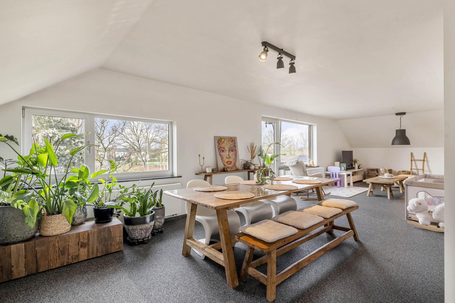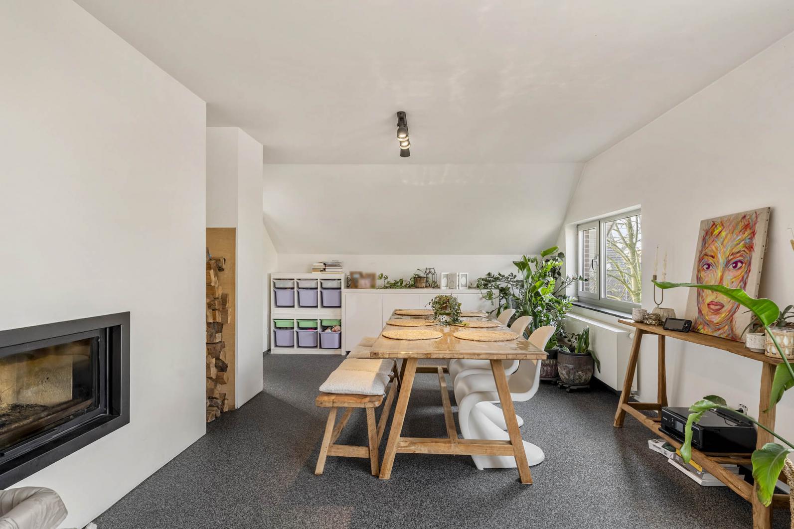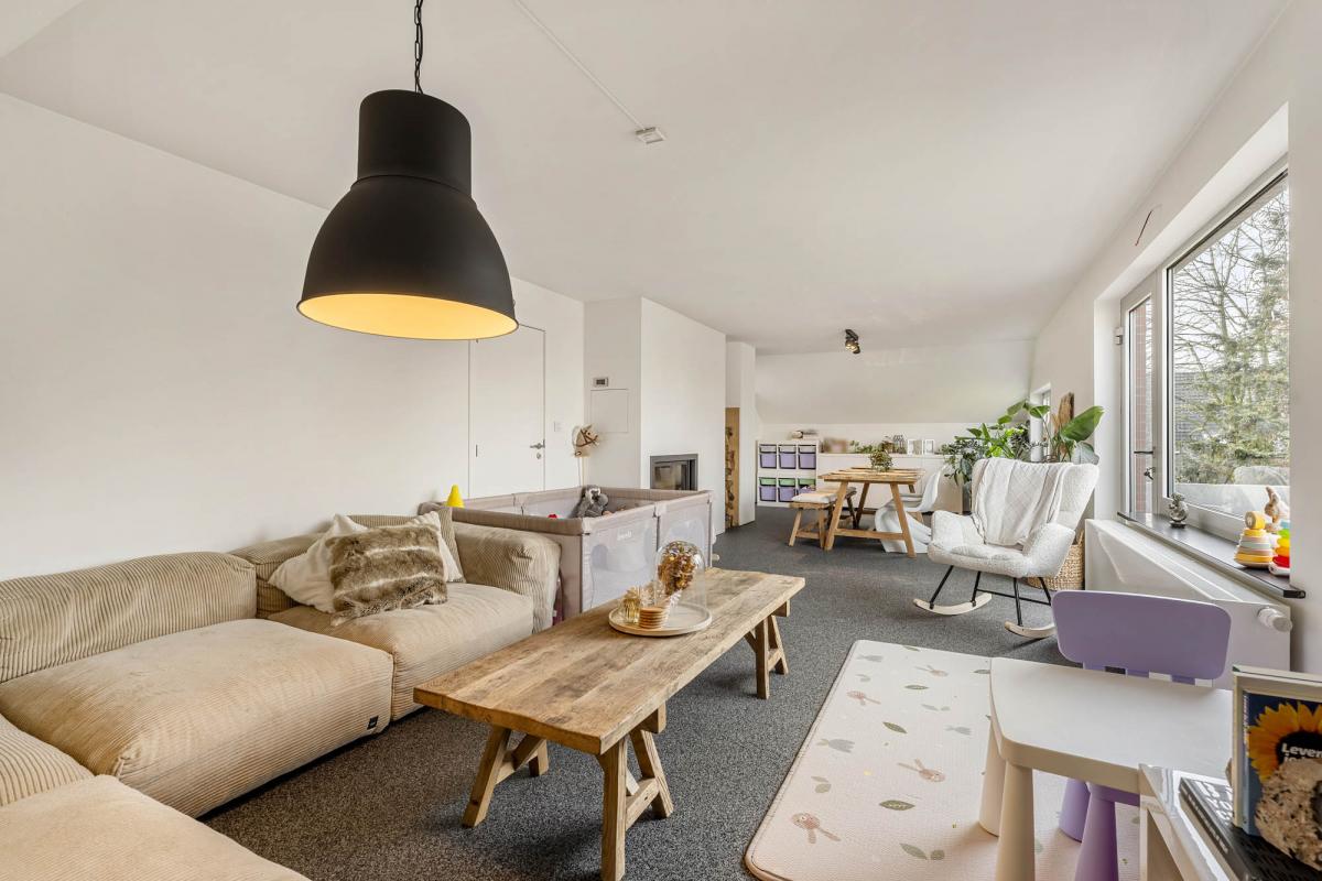 Op de eerste verdieping is er een ruime, lichtrijke leefruimte. Blikvanger is de authentieke houtkachel, die niet alleen zorgt voor een supergezellige sfeer tijdens de wintermaanden, maar ook slim is aangesloten op het verwarmingssysteem. Dankzij de combinatie van mazout, de houtkachel en een zonneboiler geniet dit appartement van een gunstig energielabel C, wat het bijzonder energiezuinig maakt in het dagelijks verbruik.