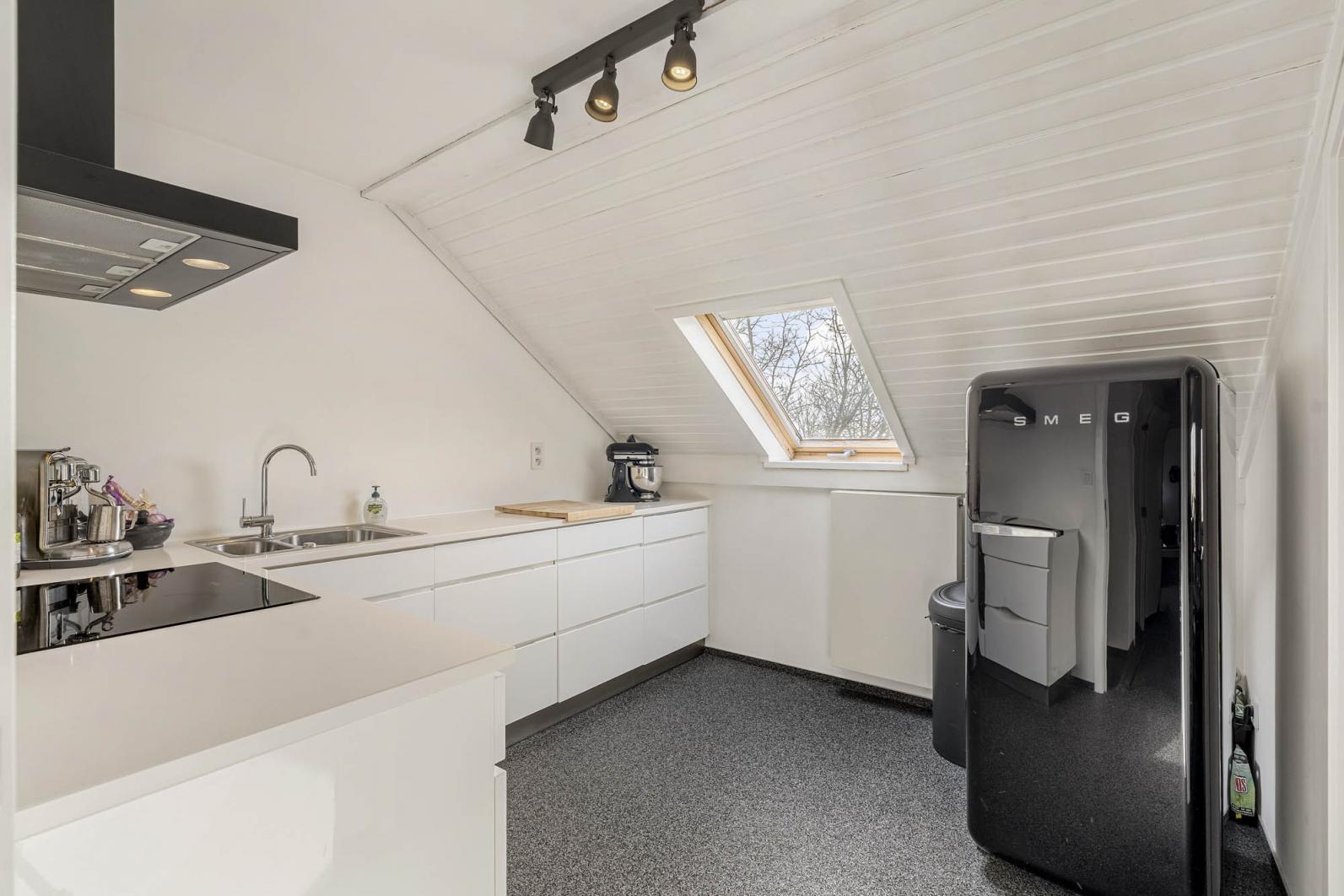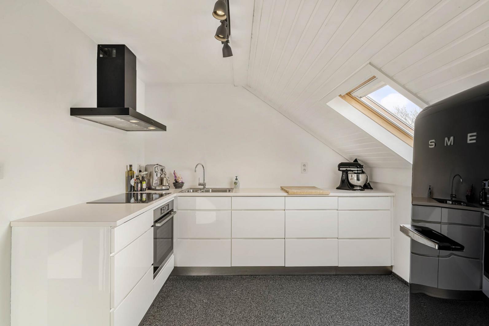 De leefruimte loopt naadloos over in een knus terras, perfect voor een kop koffie in de ochtendzon. De keuken is volledig ingericht en voorzien van alle nodige toestellen zoals een vaatwasser, inductievuur, stoomoven,...
