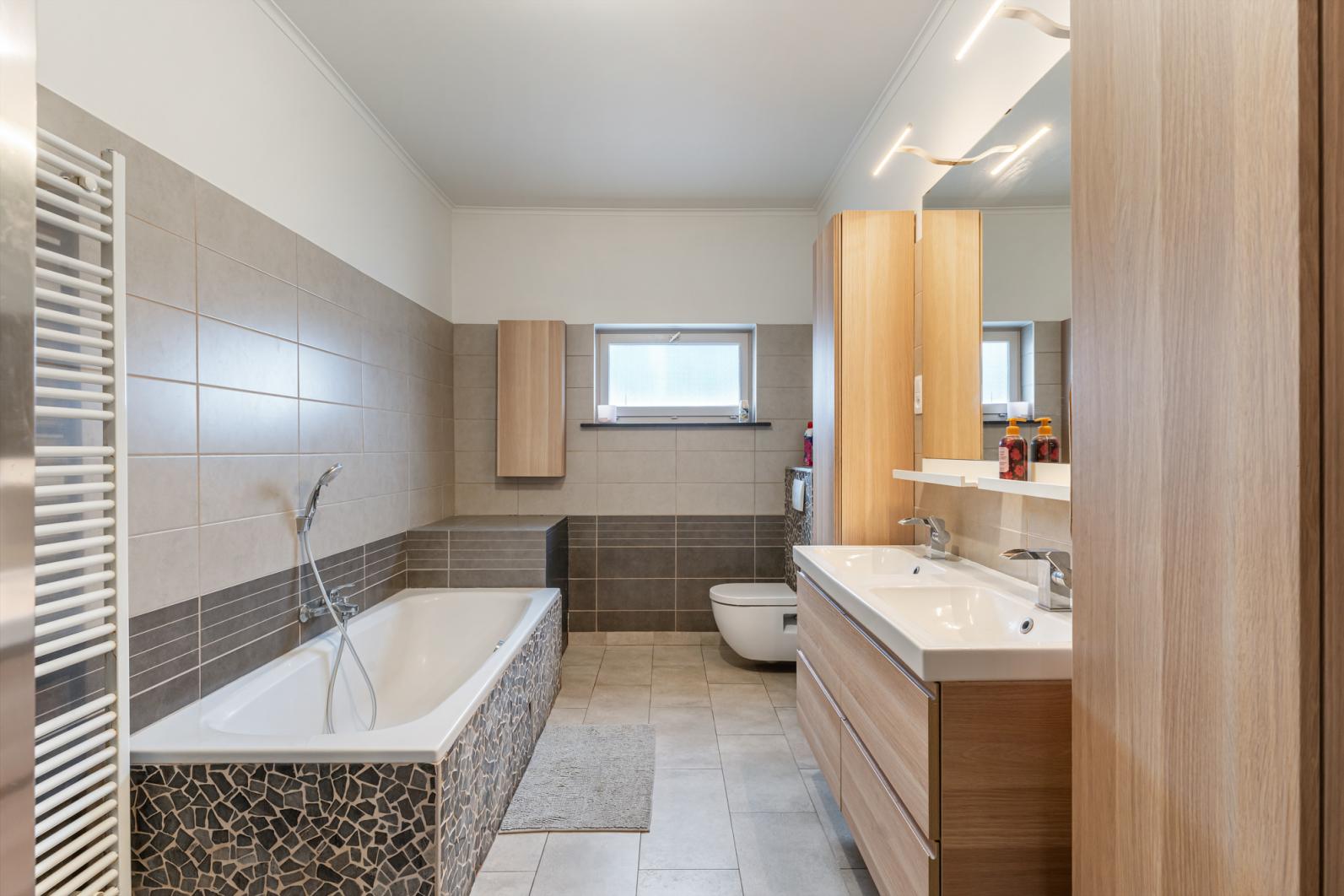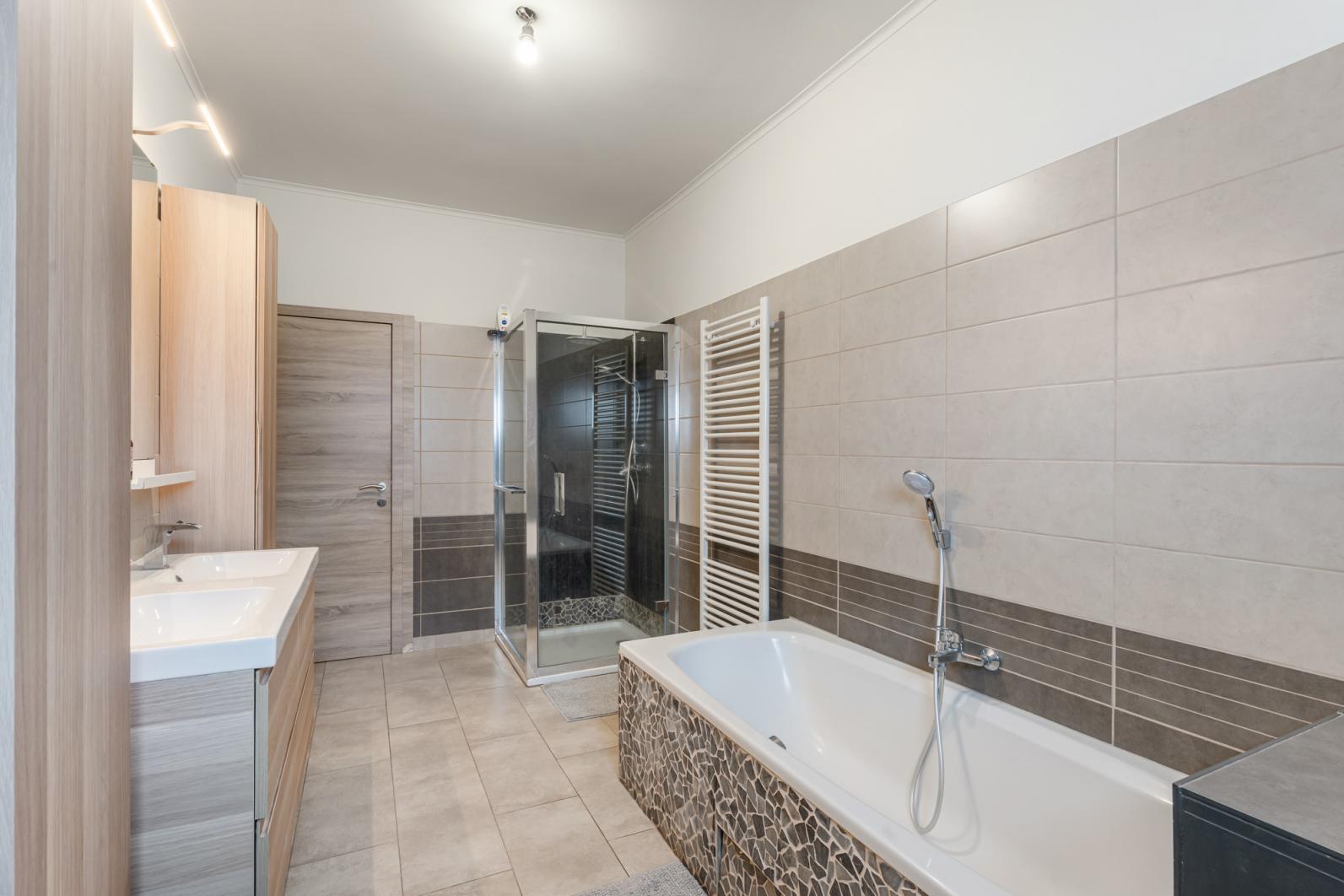 De badkamer is een oase van rust en luxe, uitgerust met zowel een ligbad als een aparte douche, een dubbele wastafel en een toilet.