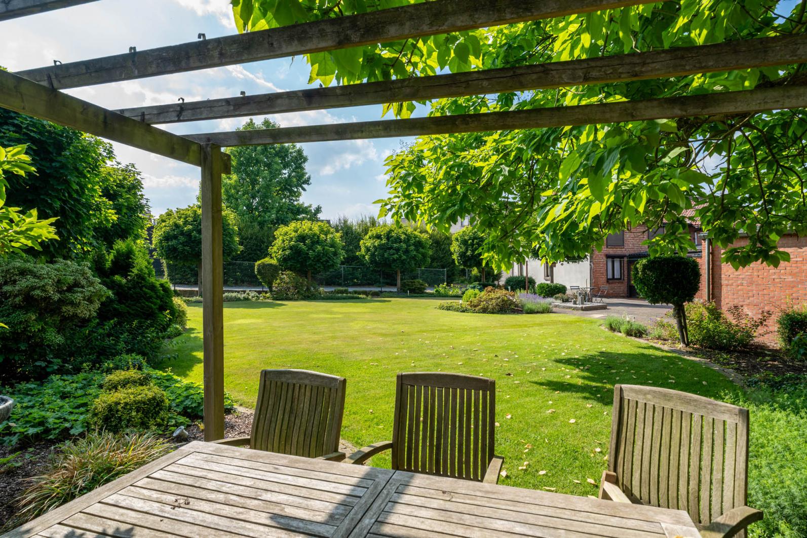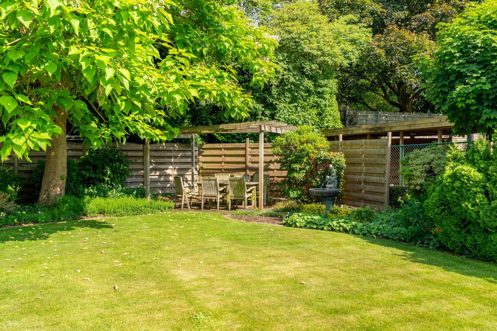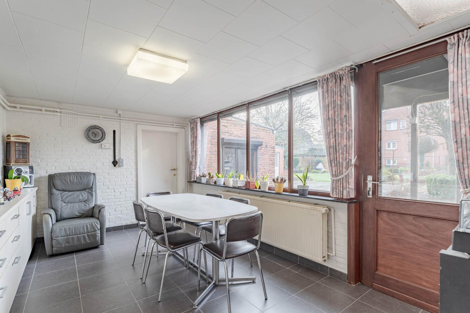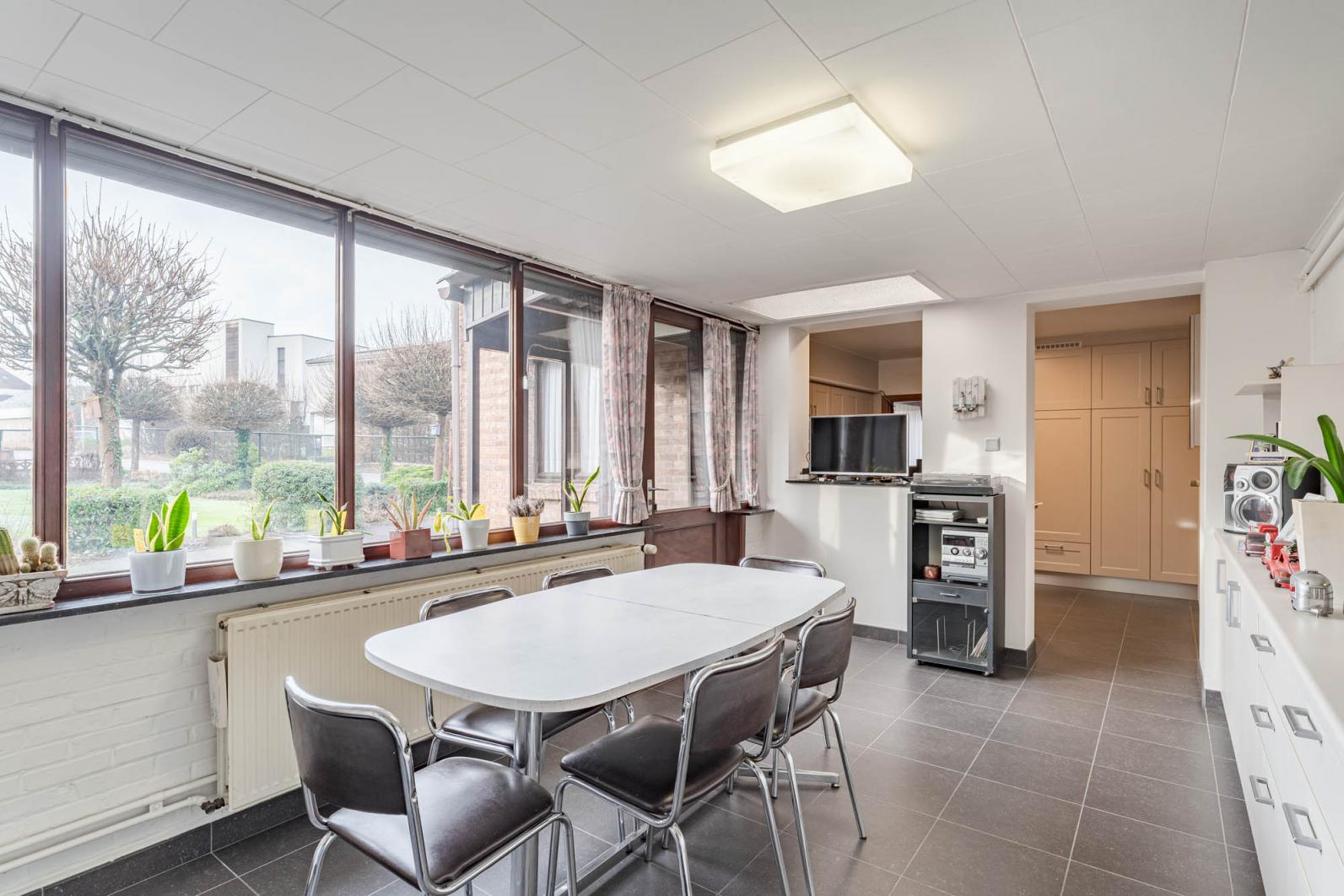 De veranda die aansluit op de keuken en uitkijkt op de tuin is ideaal voor ontspanning en gezelligheid.