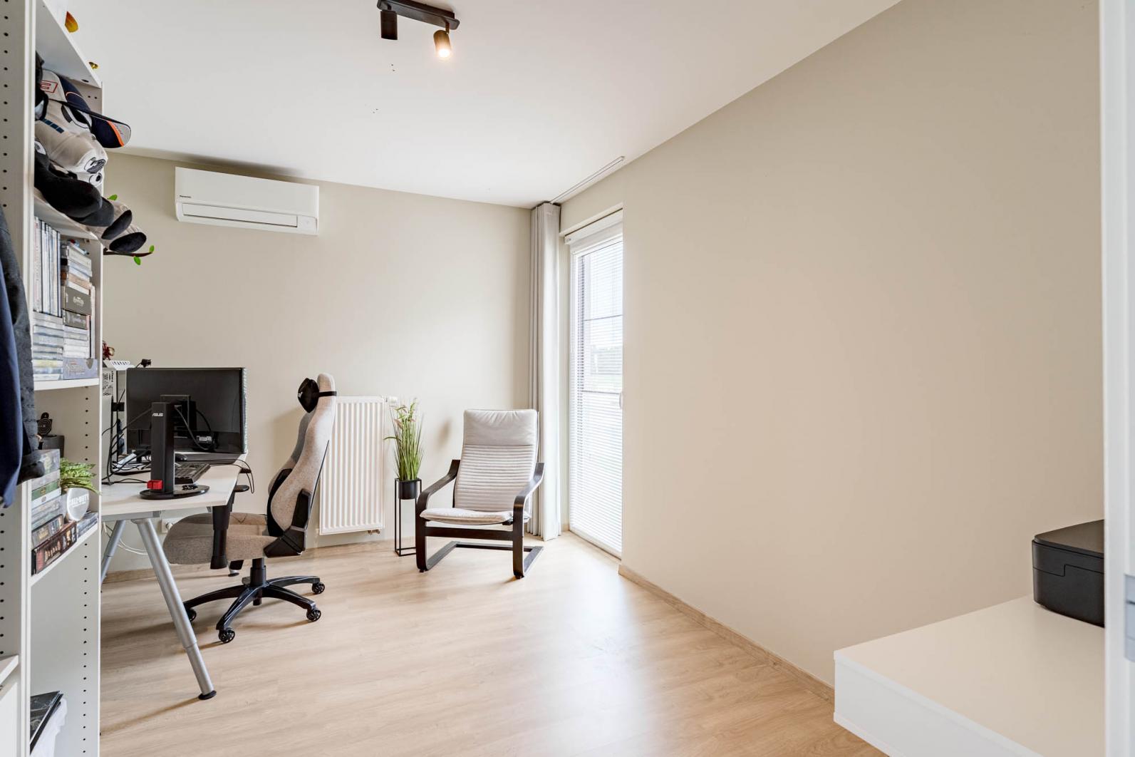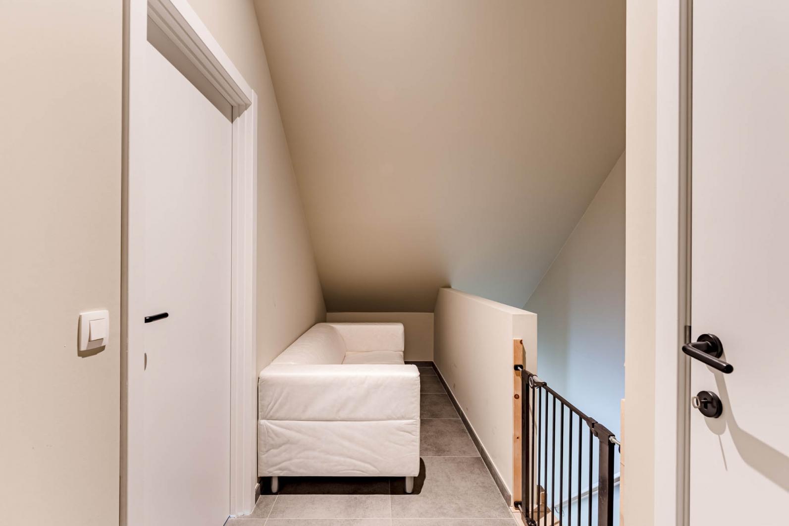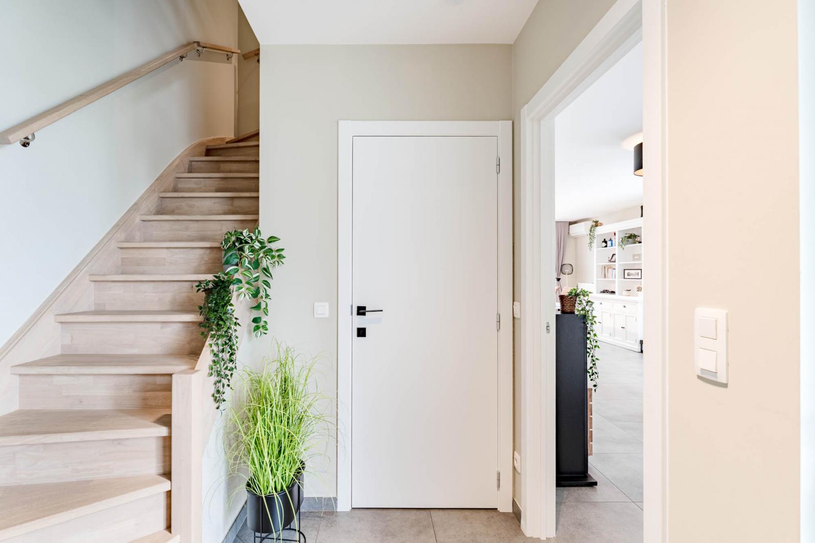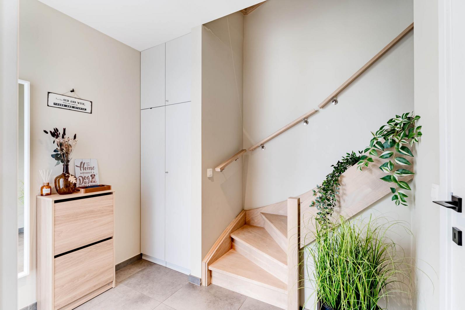 Op het gelijkvloers kom je binnen in de inkomhal met vestiare. Verder is er een leefruimte met zithoek, open keuken en eetplaats, een lichte en aangename ruimte waar voldoende ruimte is voor het hele gezin. De keuken is recent uitgerust met nieuwe, moderne toestellen. Verder vind je op deze verdieping, een wc, een wasruimte/technische ruimte, een aparte berging en een gezellige veranda.
