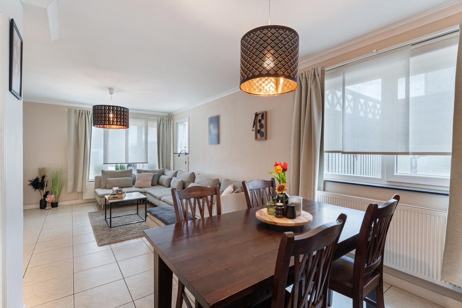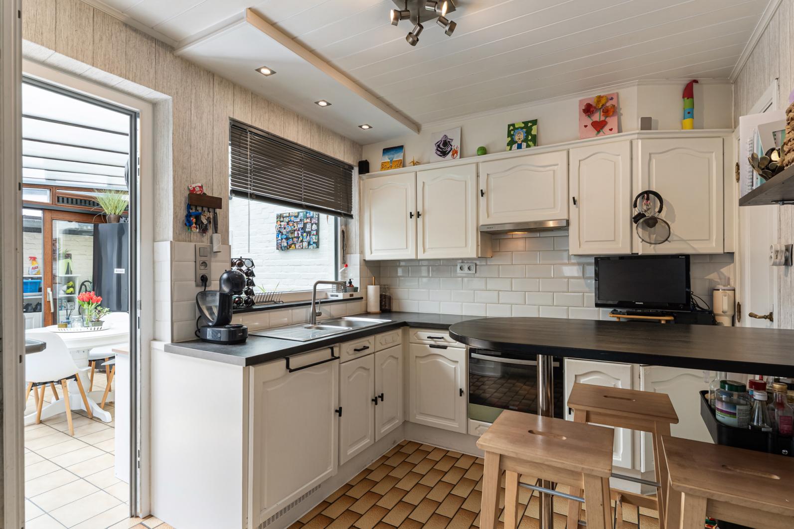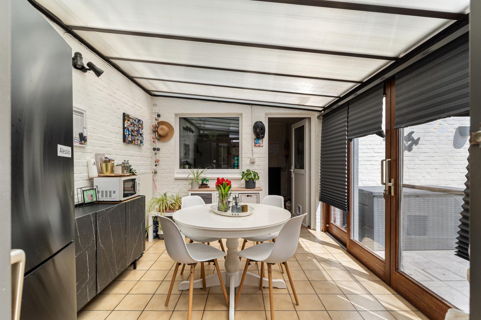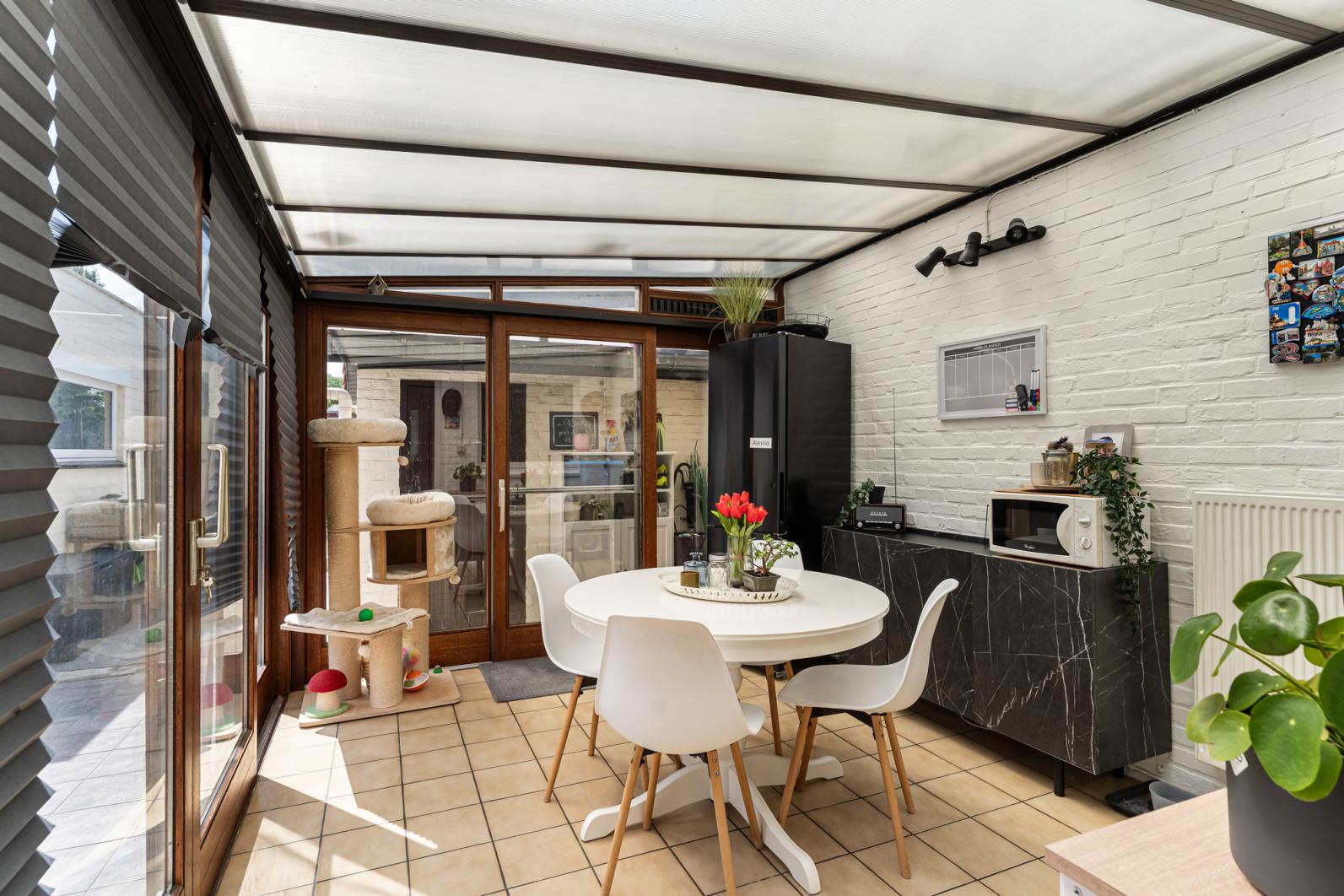 Binnenin vinden we een warme en functionele indeling, perfect voor een gezin. De gezellige zithoek en eethoek sluiten mooi aan op de keuken, waardoor je een open en huiselijke sfeer ervaart. Via de veranda, een echte troef in de tussenseizoenen,geniet je van het zicht op het terras in alle comfort.