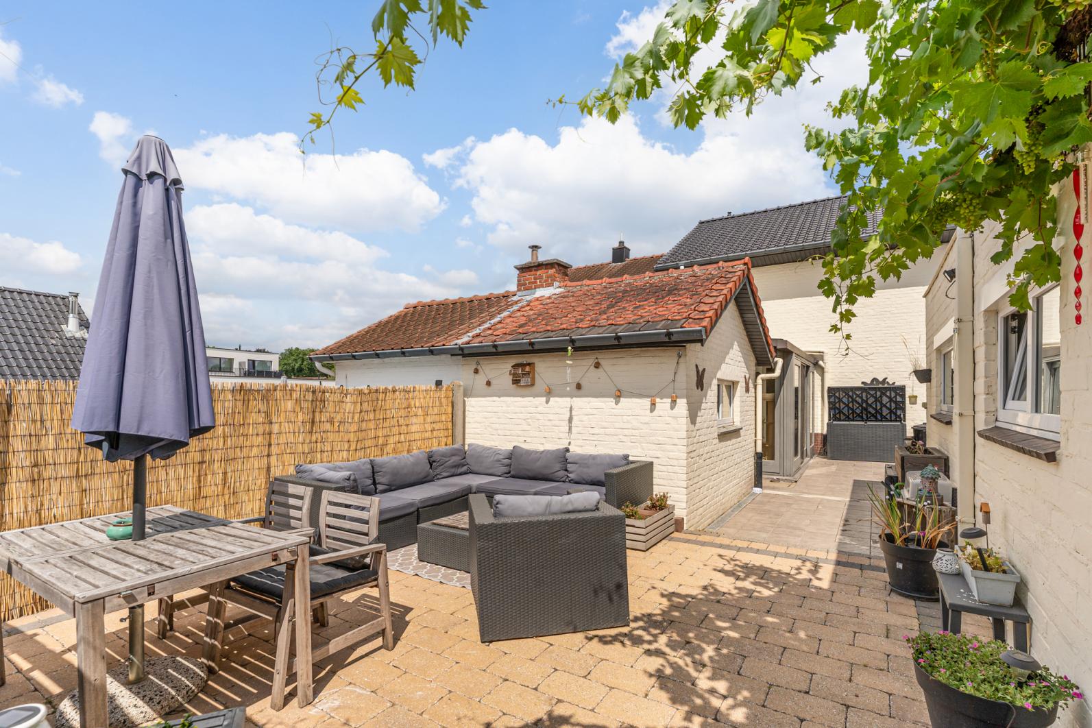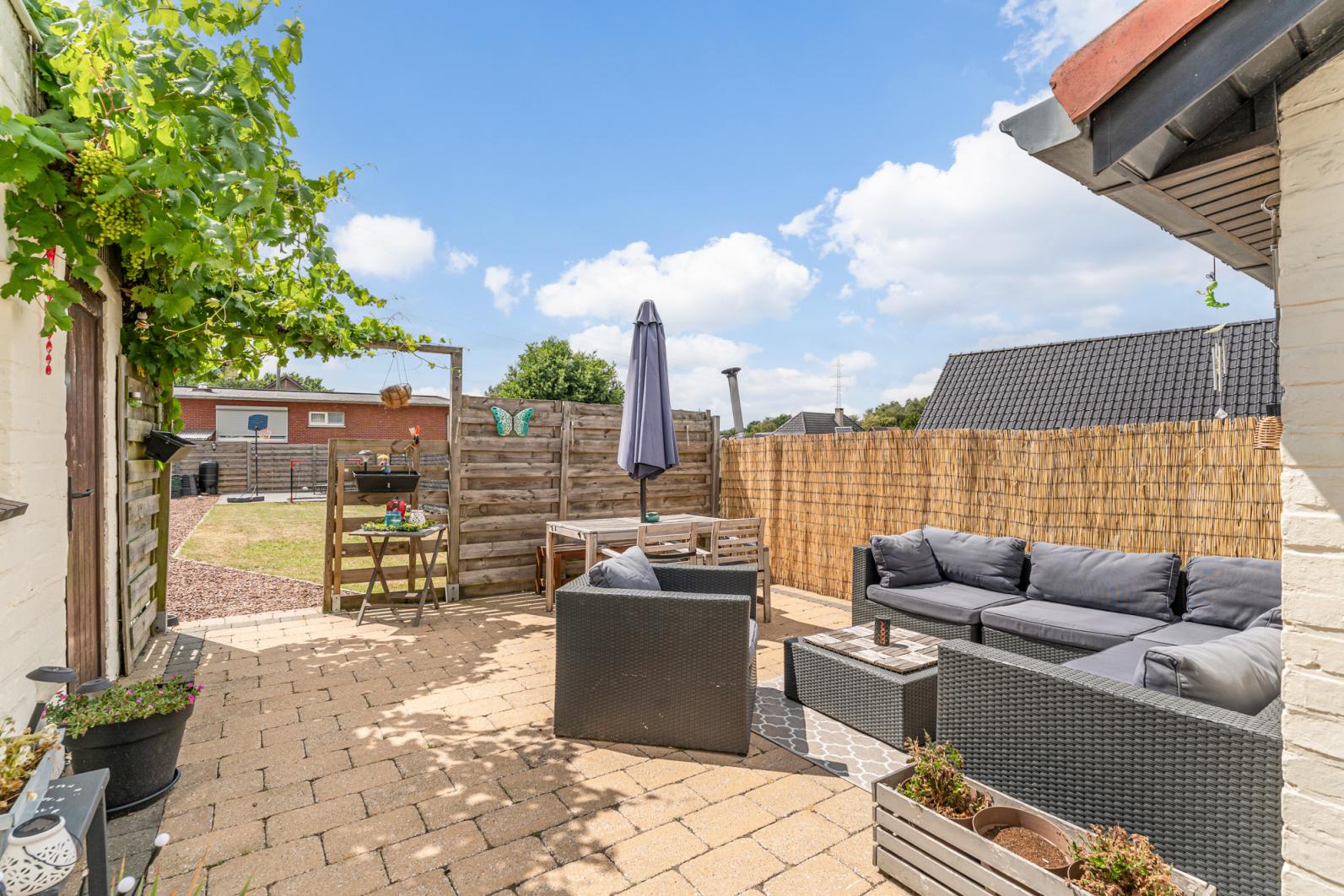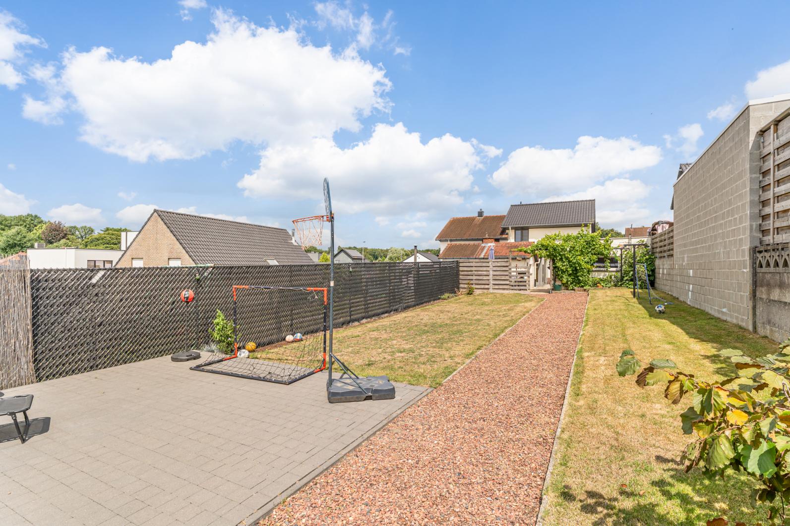 De buitenruimte is gezellig en doordacht ingericht. Er is een aangelegd terras met loungehoek voor zomerse avonden en een grasveld waar kinderen naar hartenlust kunnen spelen.